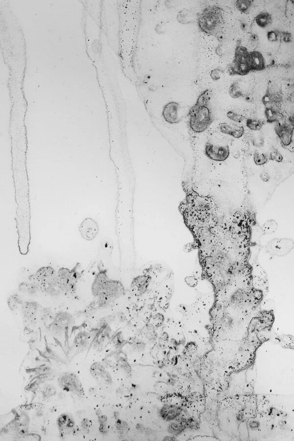 For this work, I ground charcoal into a powder, mixed it with water, and dripped it over canvas. Using a macro lens, I explored these artificial, abstract landscapes, looking for the small scenes formed within the larger whole.